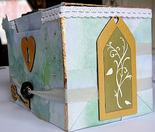 Next some of the Tando was stamped and embossed with White EP. A sheet of 12x12 Vellum cut into and part of the flower pattern stuck to the front of the box. Another bird stamp added in Brilliance ink the design highlighted with clear gems. Some white cotton lace stuck around the top of the box. DST run down sides and covered with gliding flakes. Finally some pale green ribbon stretched over the back, the top ribbon has a glass bead threaded onto it, and a single piece of ribbon stretched over the front also with a glass bead.